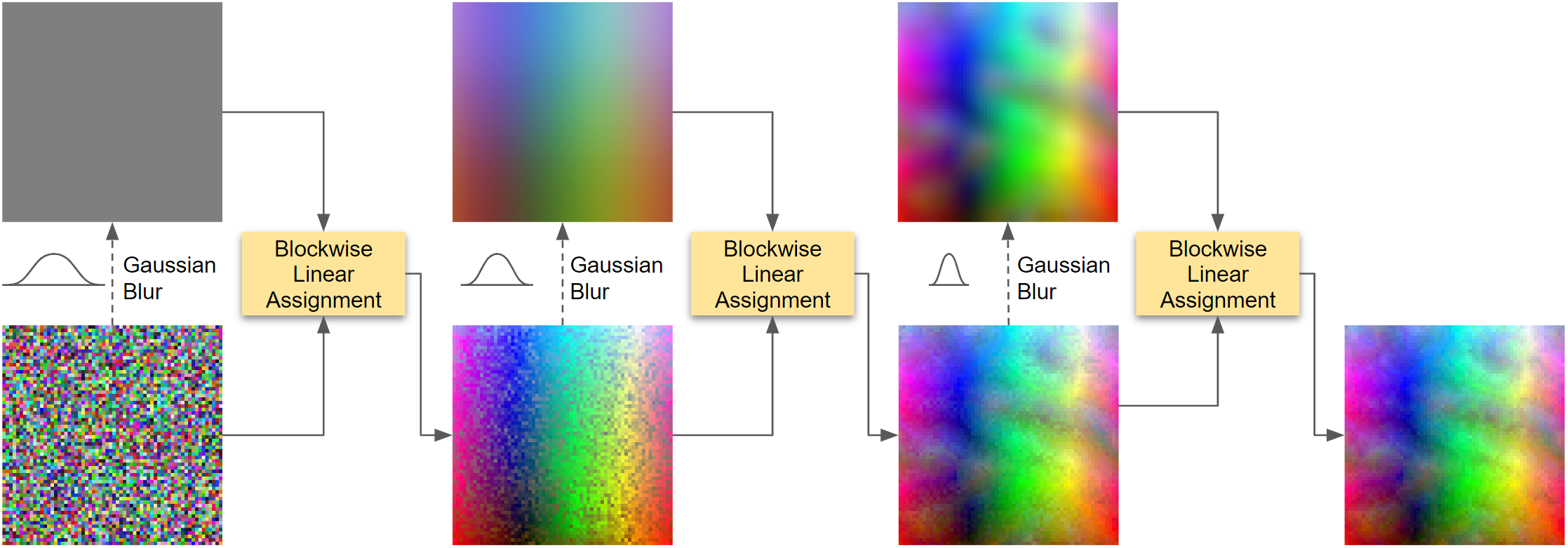 For each re-assignment step, the grid is divided into blocks of size $\beta = \varphi + 1$ (minimum $\beta = 16$ to maintain efficient parallelization), and each block is solved independently as a linear assignment problem. To sort across block boundaries, all blocks are shifted by a random $(\Delta x, \Delta y)$ before each re-assignment.