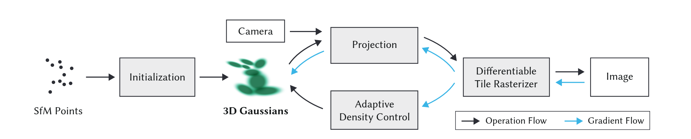Given the calibrated cameras and sparse point cloud from SfM, we initialize the scene with a set of 3D Gaussians, each parameterized by mean (position), covariance (shape/orientation), opacity alpha, and view-dependent color represented with spherical harmonics (SH). The rendering pipeline projects these Gaussians onto the image plane as 2D ellipses, evaluates their color and opacity, and alpha-composites them in visibiliy order using a tile-based rasterizer. Training alternates between optimizing Gaussian parameters end to end against ground truth images and adaptive density control (splitting, cloning, and pruning). I will walk through each stage below.